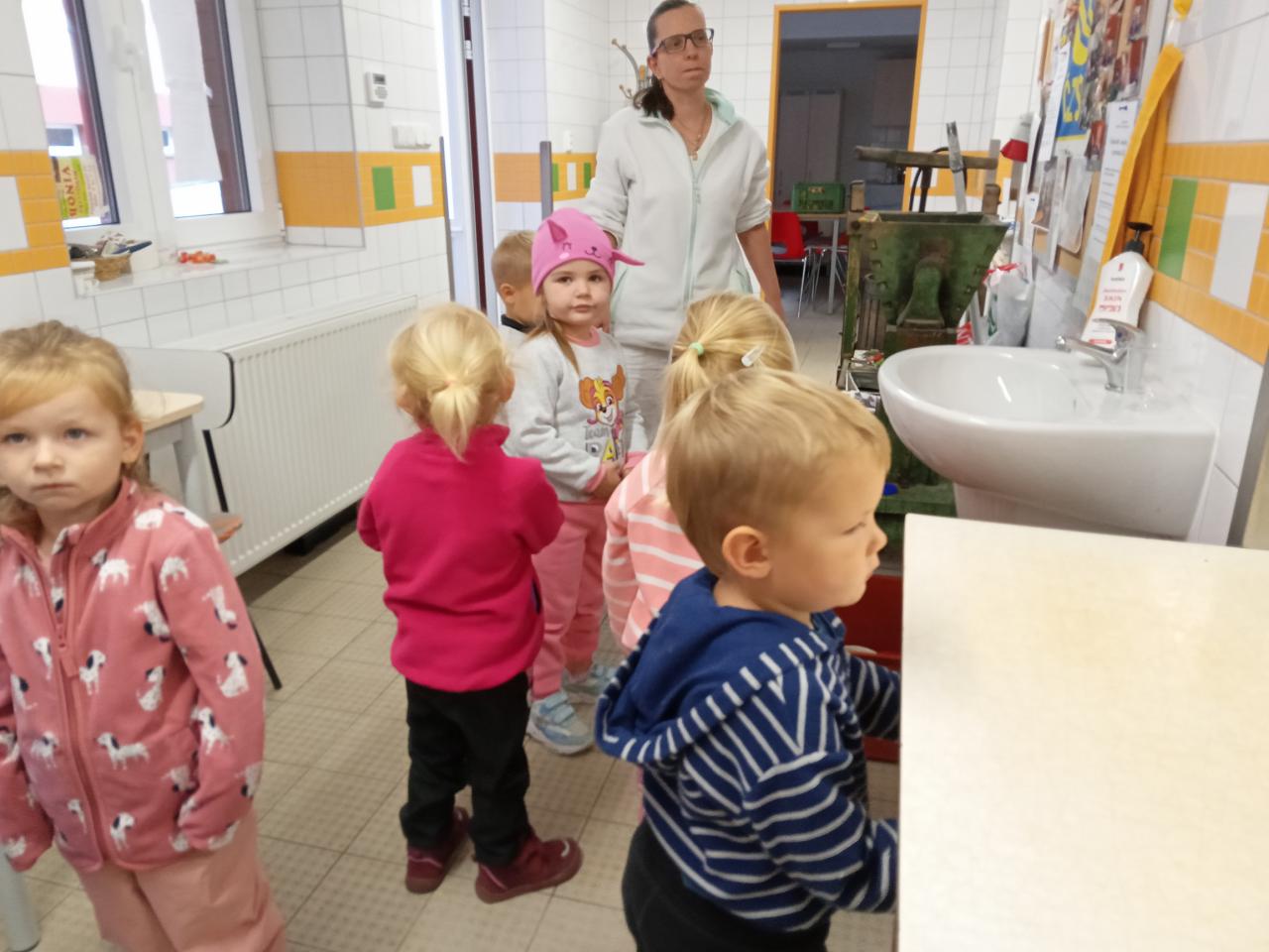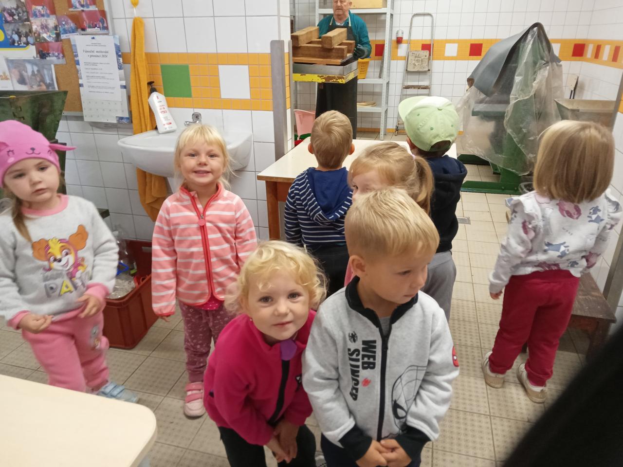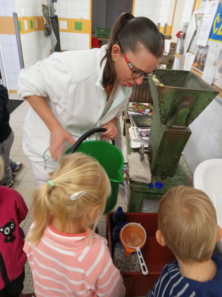 Broučci s "náhradní" paní učitelkou Simčou od včeliček a za vydatné pomoci paní uklízečky, tety Petry, prozkoumali dýšinskou moštárnu a seznámili se s celým procesem s výsledným ochutnáváním sladkého moštu.