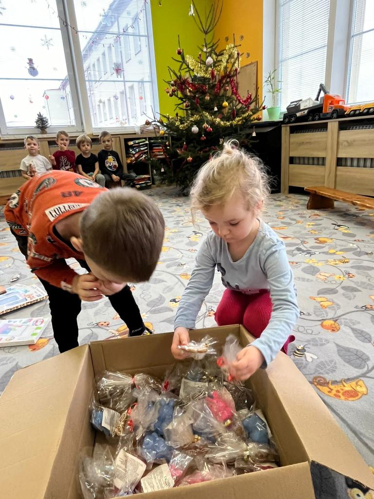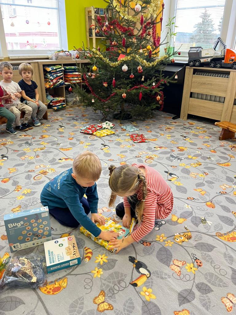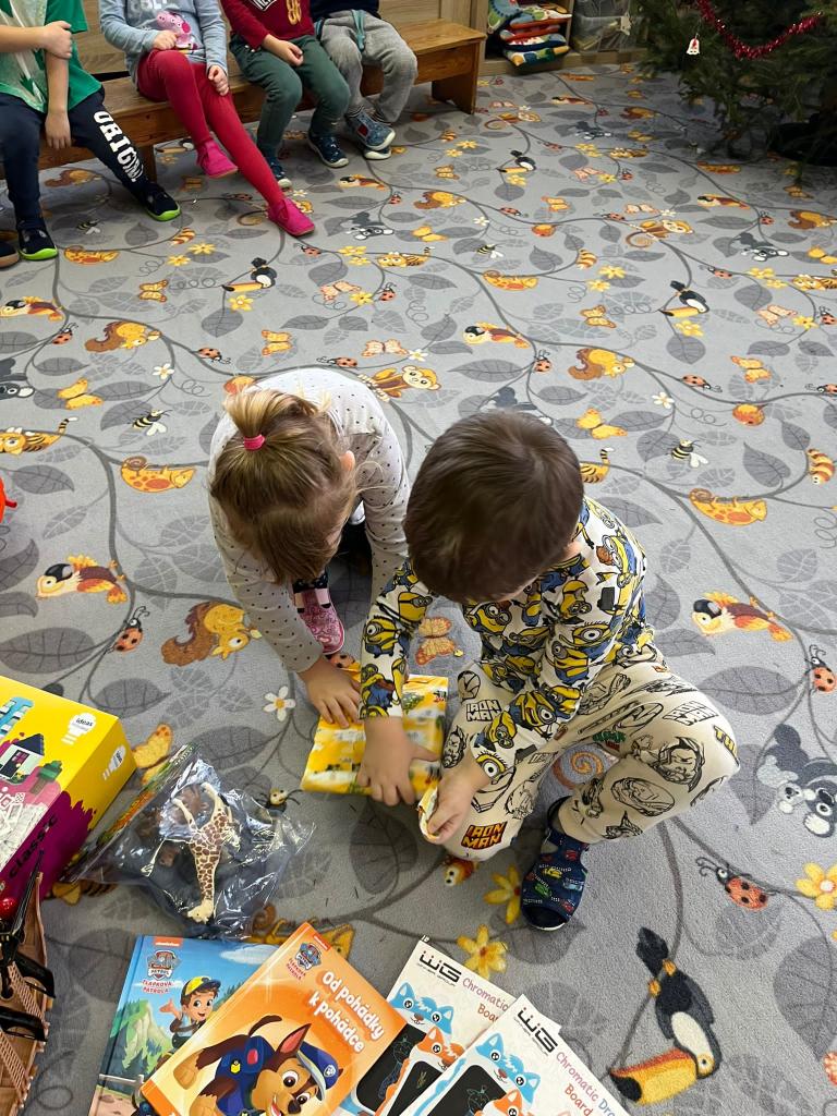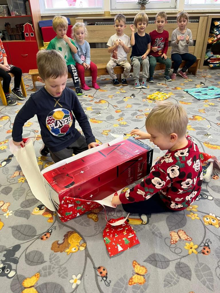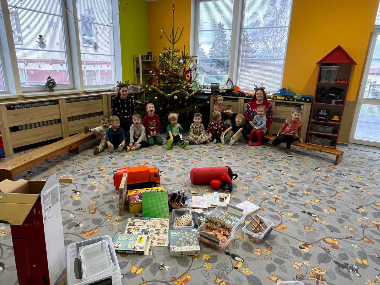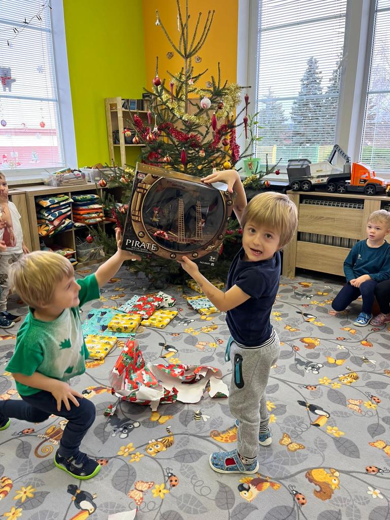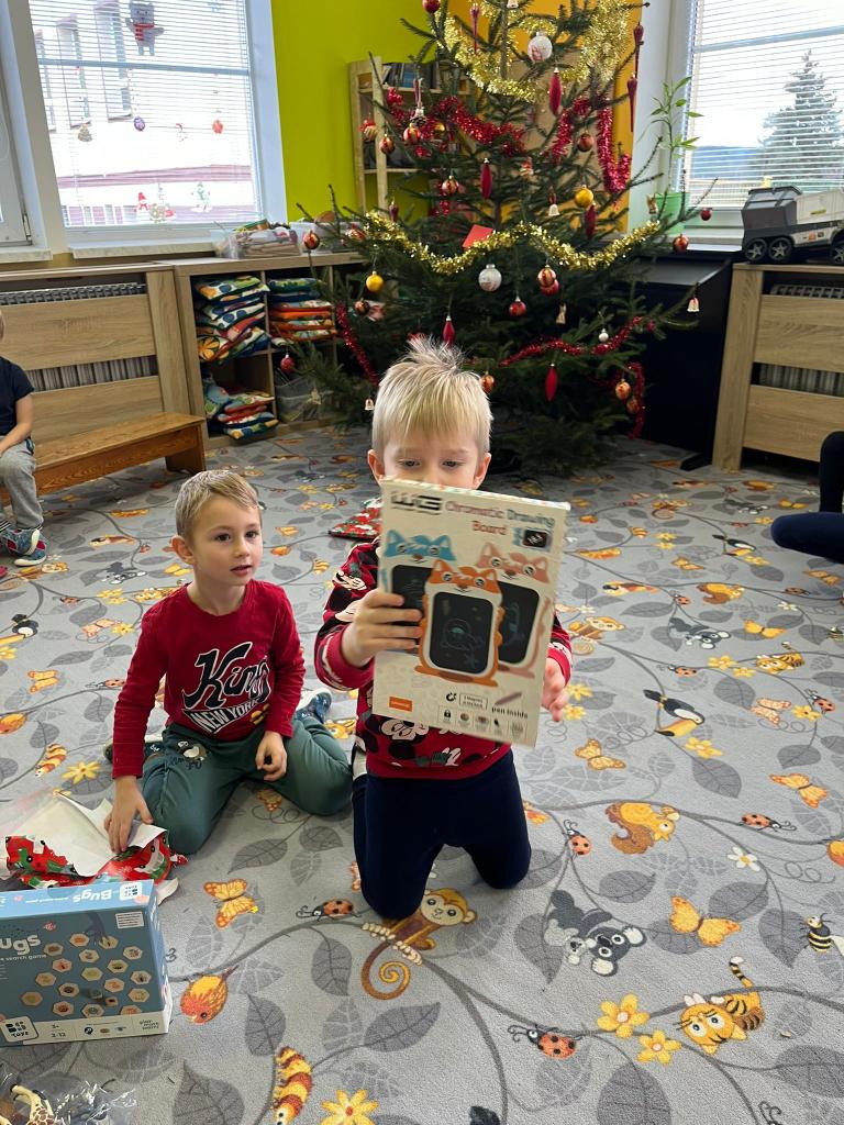 Děti si s nadšením rozbalily boxovací pytel, popelářské auto, didaktické hry (chytání rybiček, hledání barevných kolíčků, balanční panáčci), lego, tabulku na malování svého kamaráda, dětské tablety, skládací tetris, zvířátka z mořského světa a Afriky a mnoho dalších.