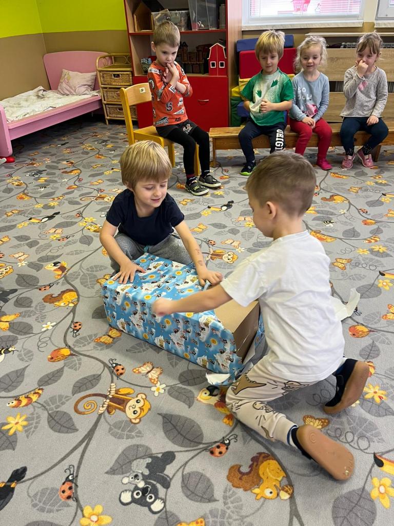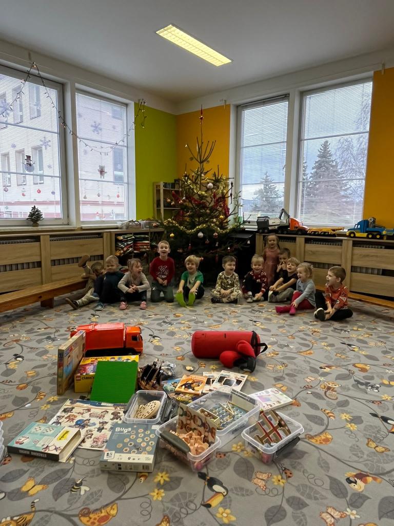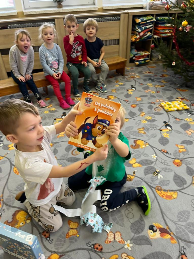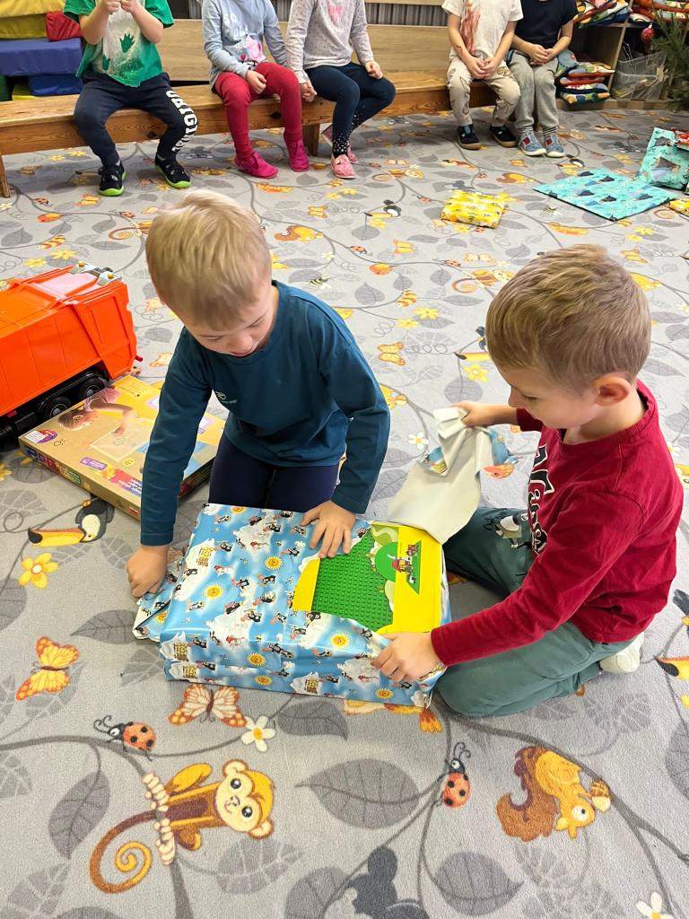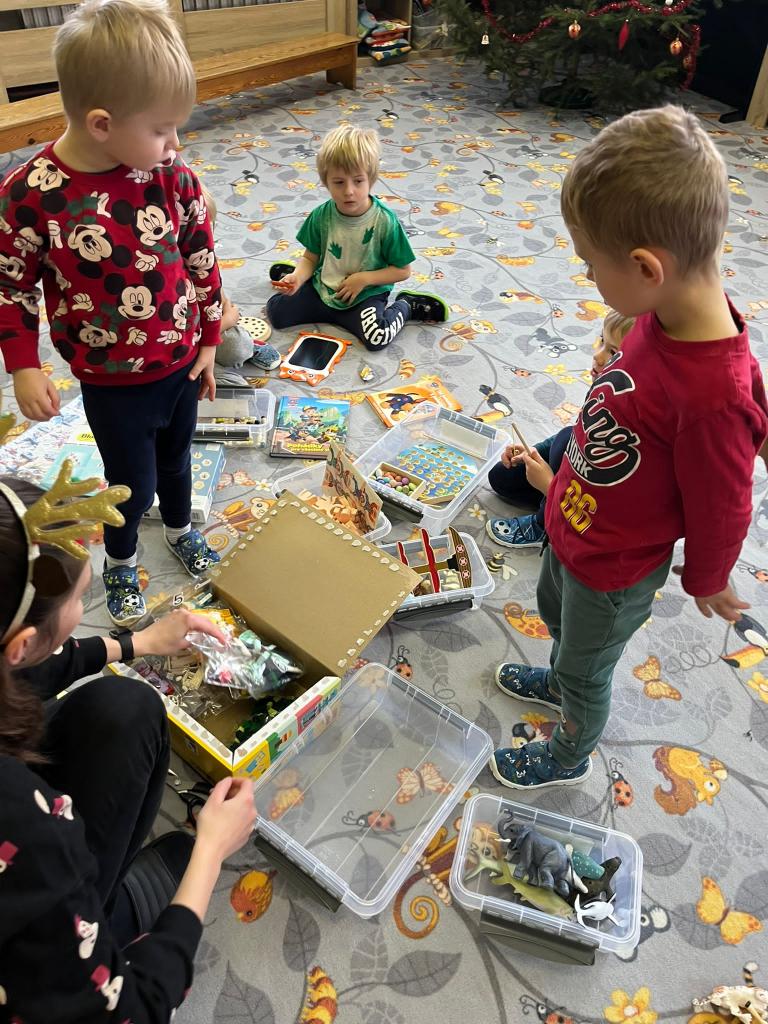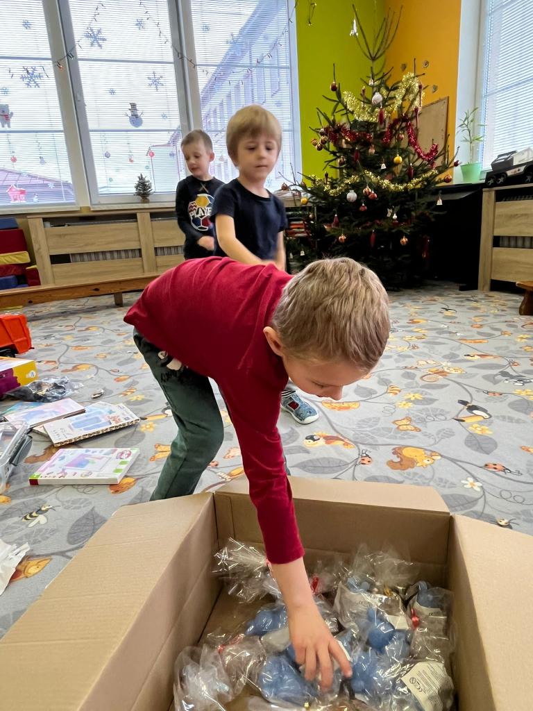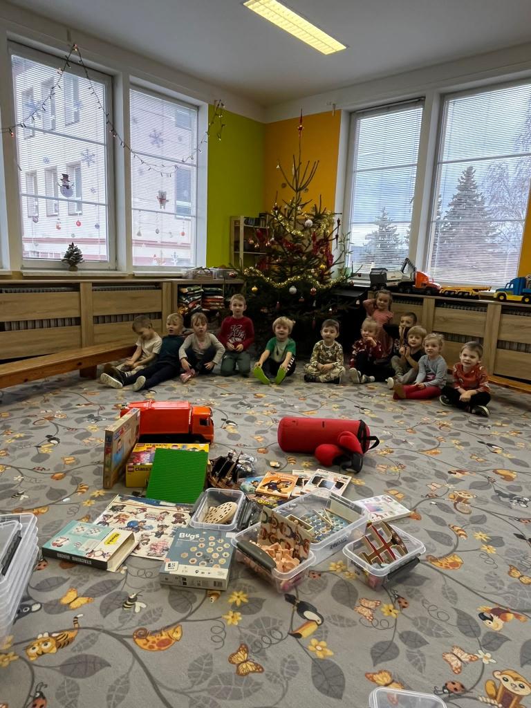 Děti si s nadšením rozbalily boxovací pytel, popelářské auto, didaktické hry (chytání rybiček, hledání barevných kolíčků, balanční panáčci), lego, tabulku na malování svého kamaráda, dětské tablety, skládací tetris, zvířátka z mořského světa a Afriky a mnoho dalších.