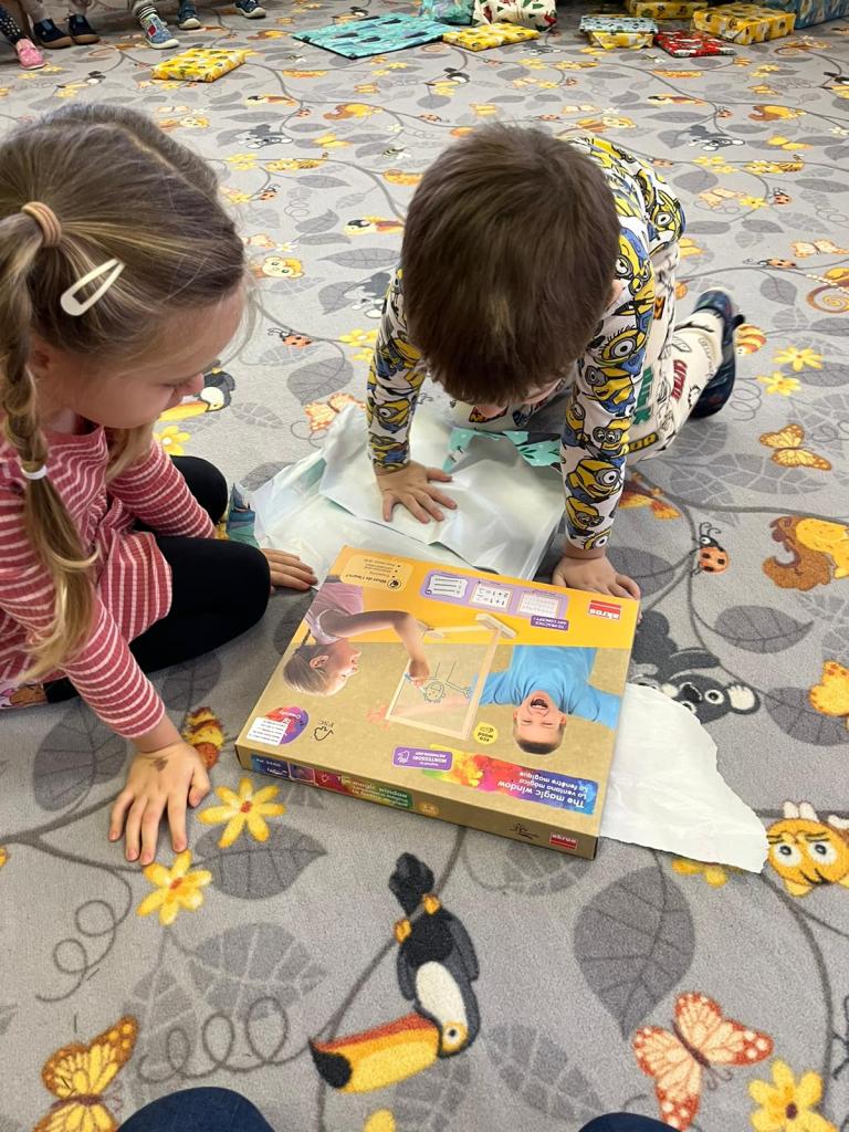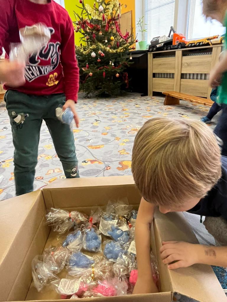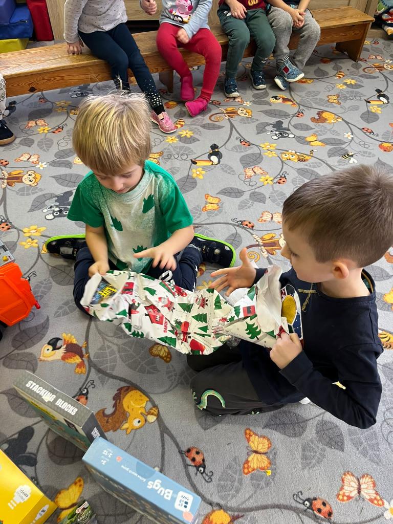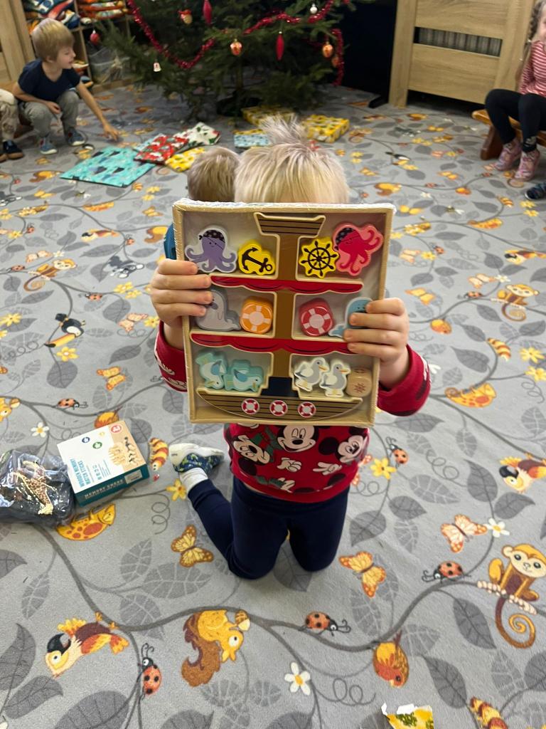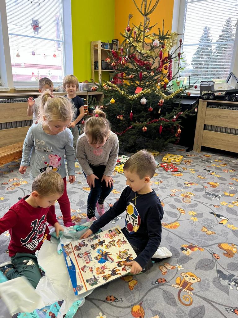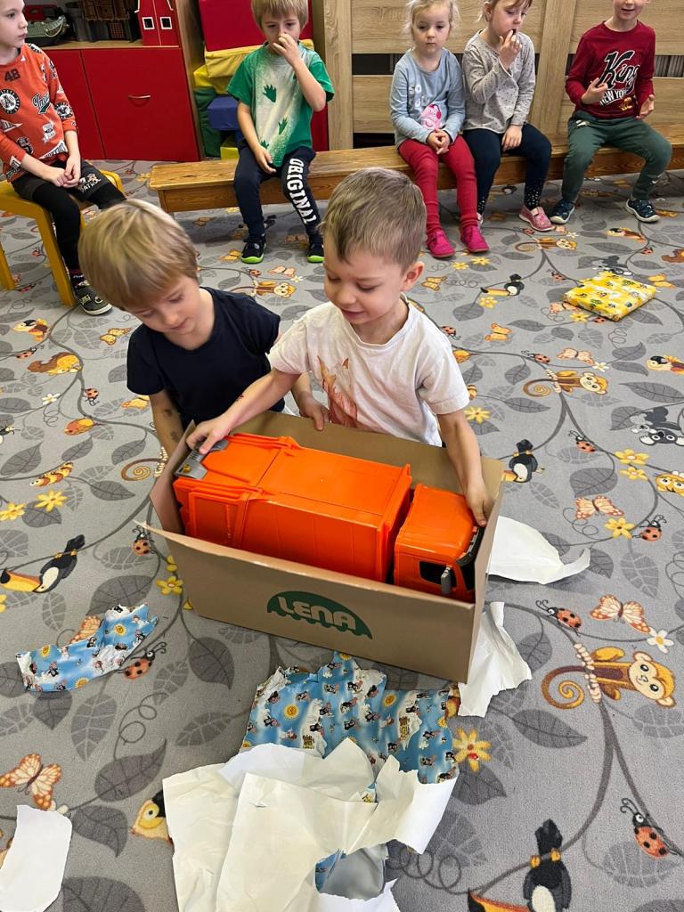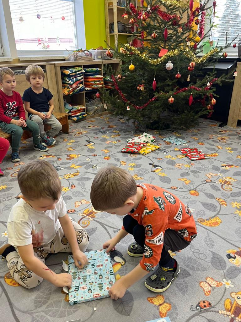 Děti si s nadšením rozbalily boxovací pytel, popelářské auto, didaktické hry (chytání rybiček, hledání barevných kolíčků, balanční panáčci), lego, tabulku na malování svého kamaráda, dětské tablety, skládací tetris, zvířátka z mořského světa a Afriky a mnoho dalších.