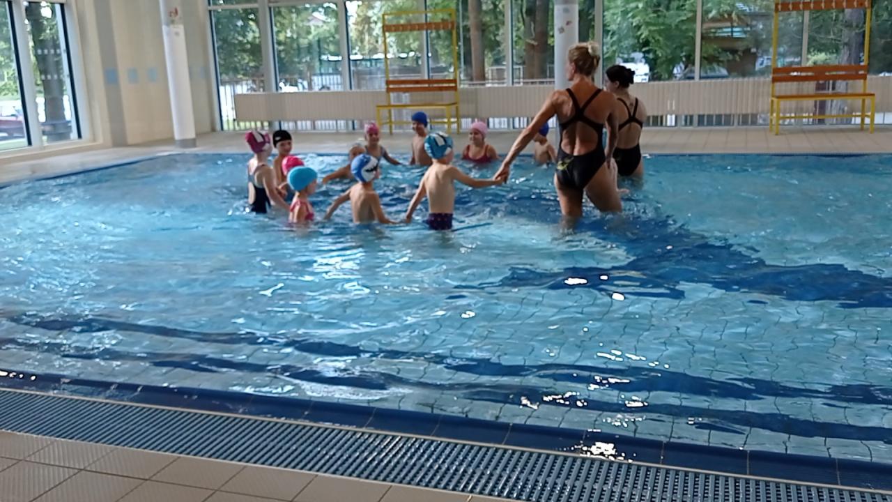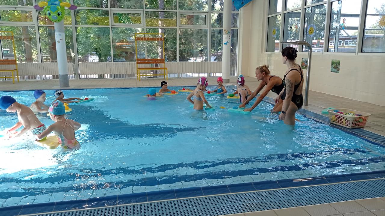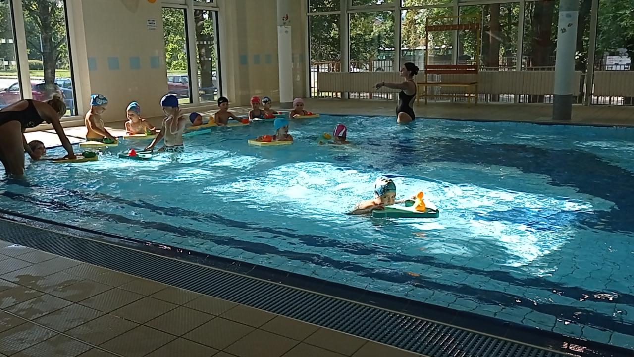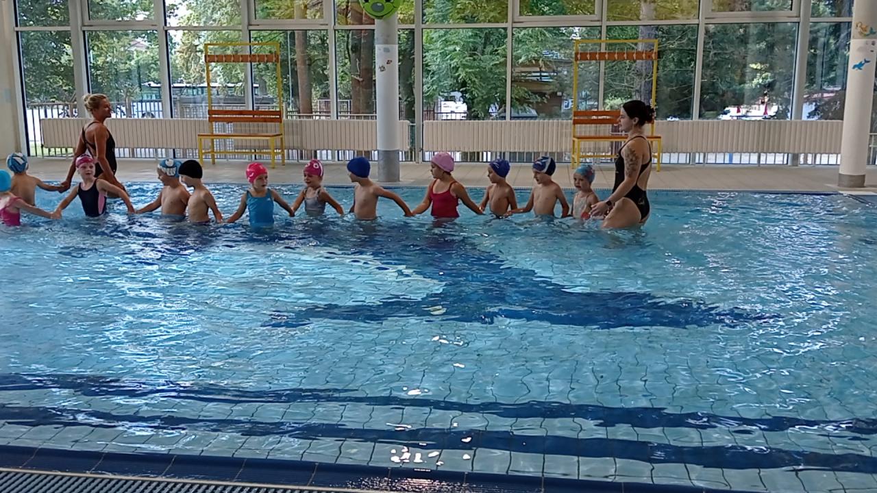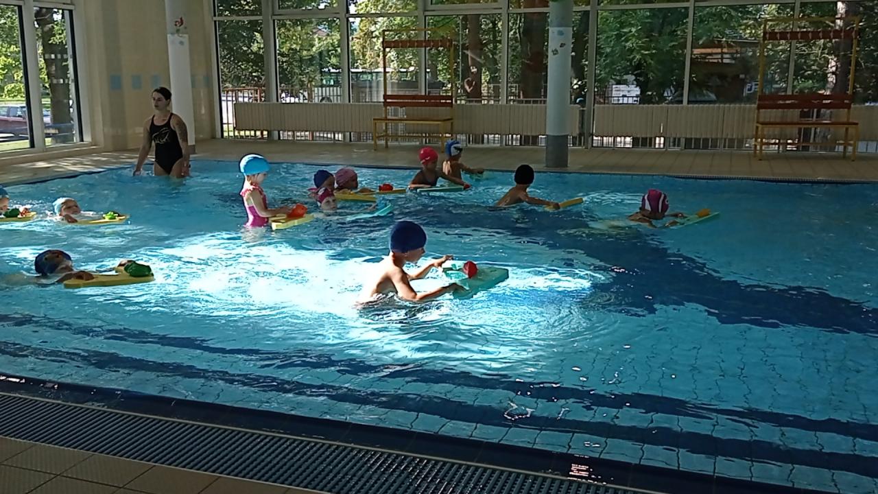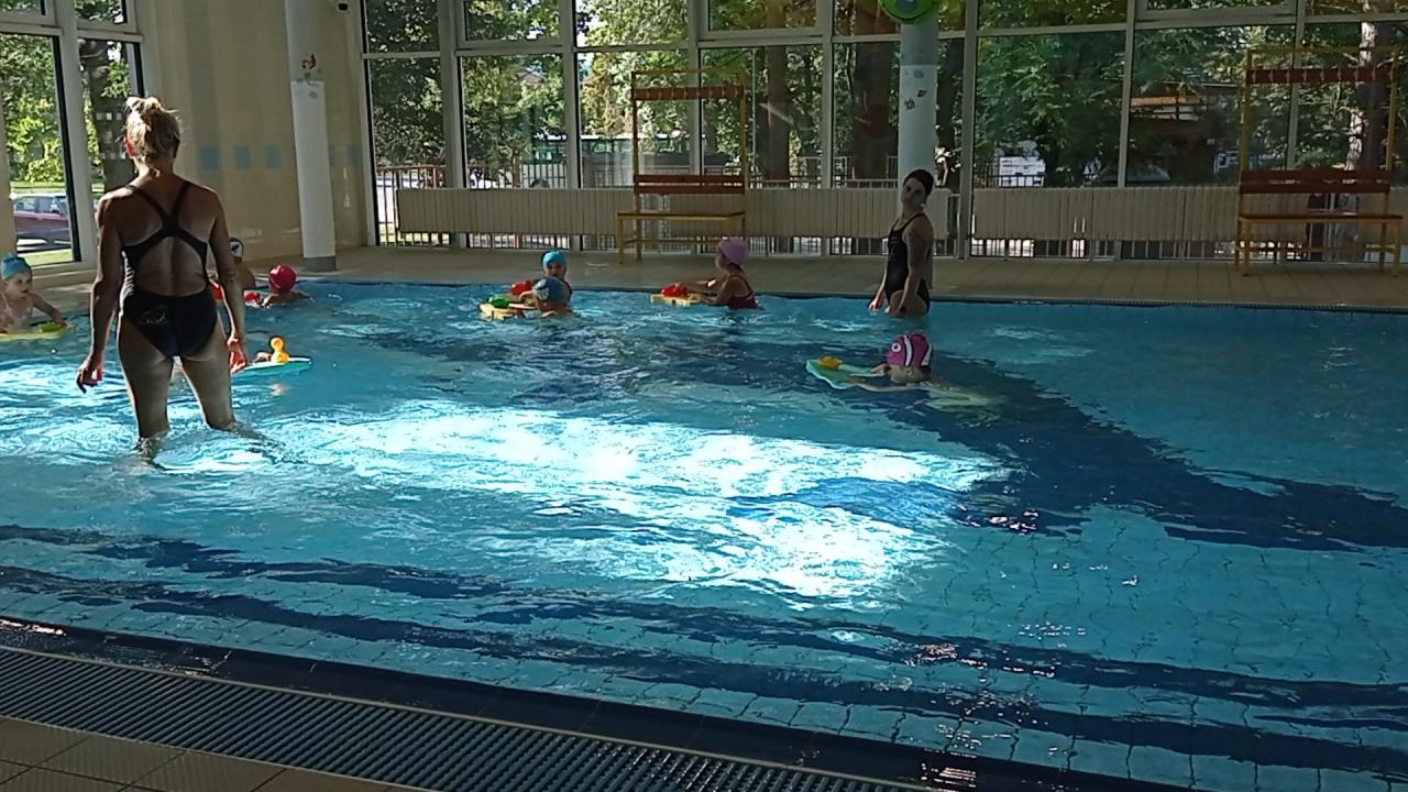 První lekce - seznamování s vodou. Had leze z díry, Kolo mlýnský, hrajeme si na zvířátka... My se vody nebojíme!