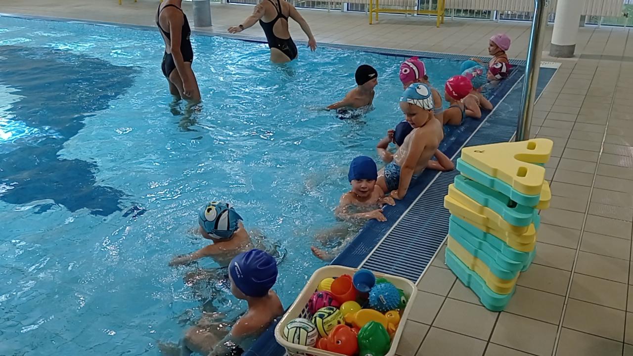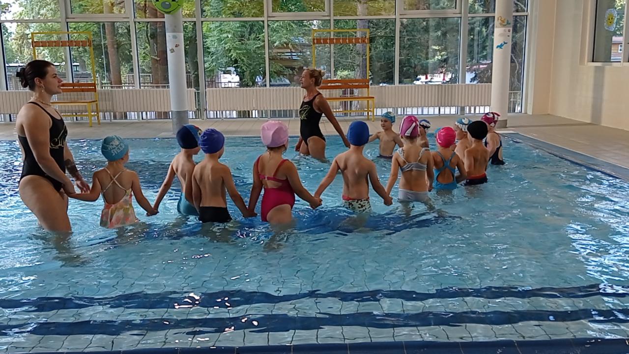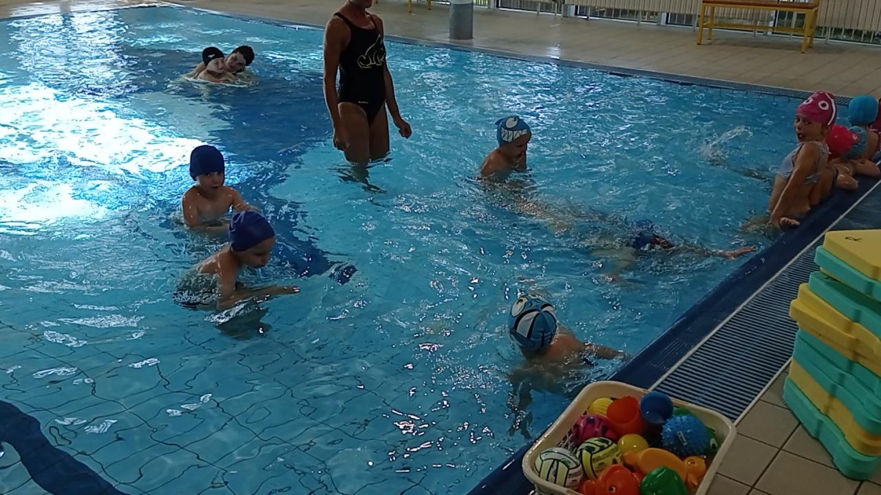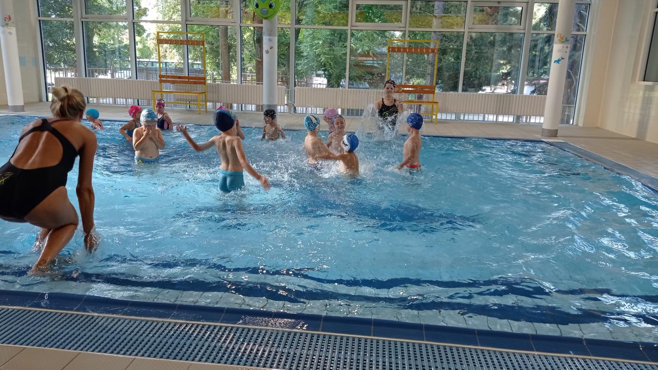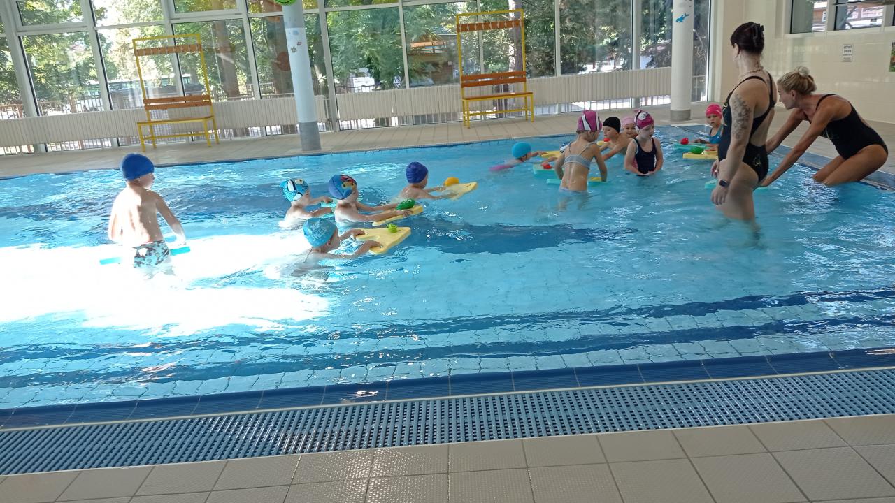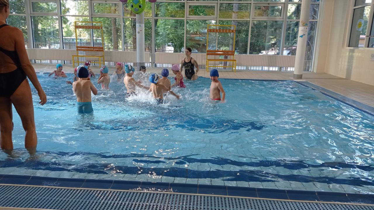 První lekce - seznamování s vodou. Had leze z díry, Kolo mlýnský, hrajeme si na zvířátka... My se vody nebojíme!
