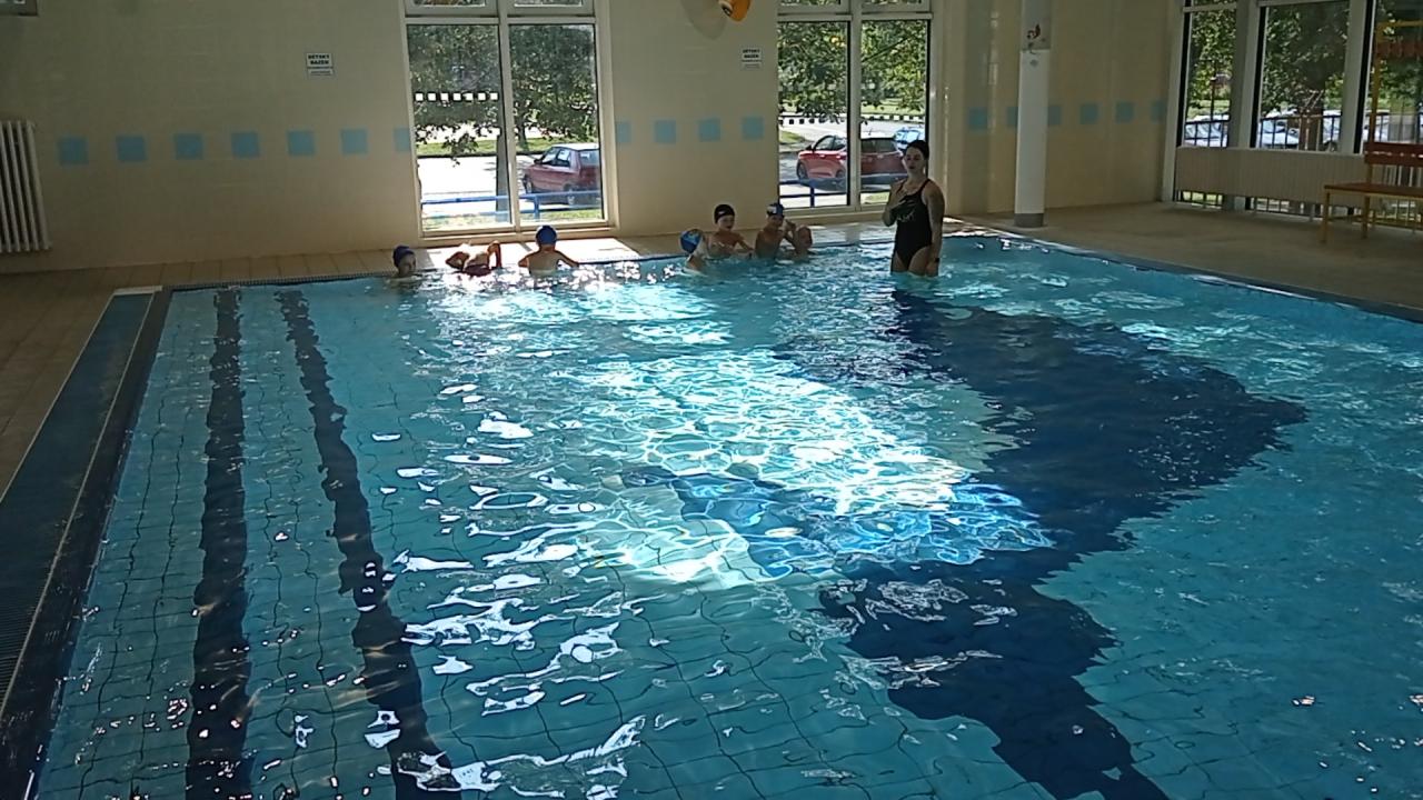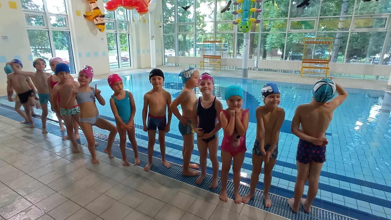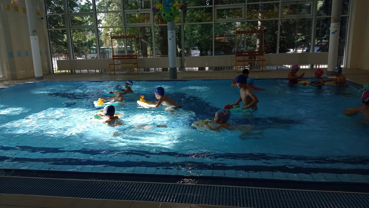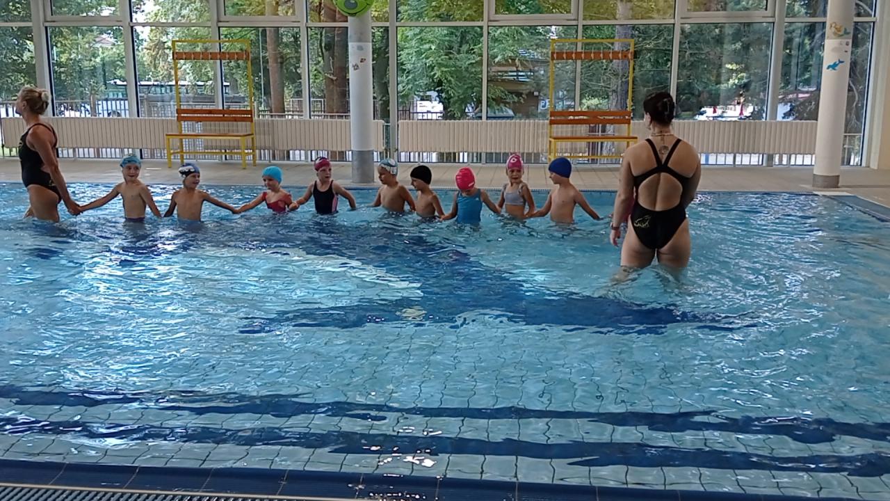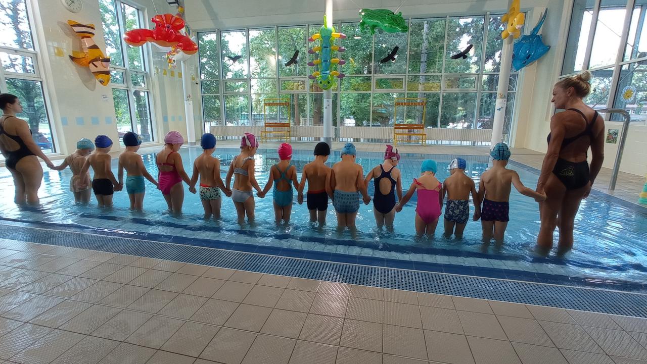 První lekce - seznamování s vodou. Had leze z díry, Kolo mlýnský, hrajeme si na zvířátka... My se vody nebojíme!
