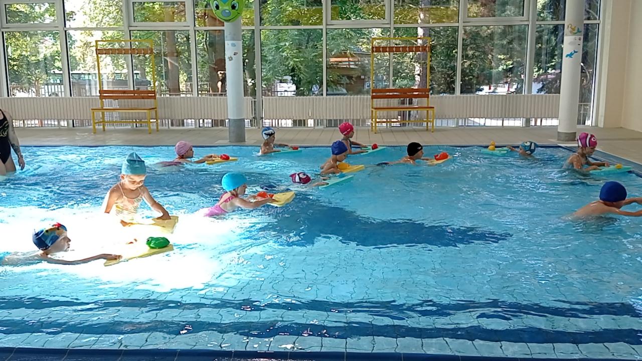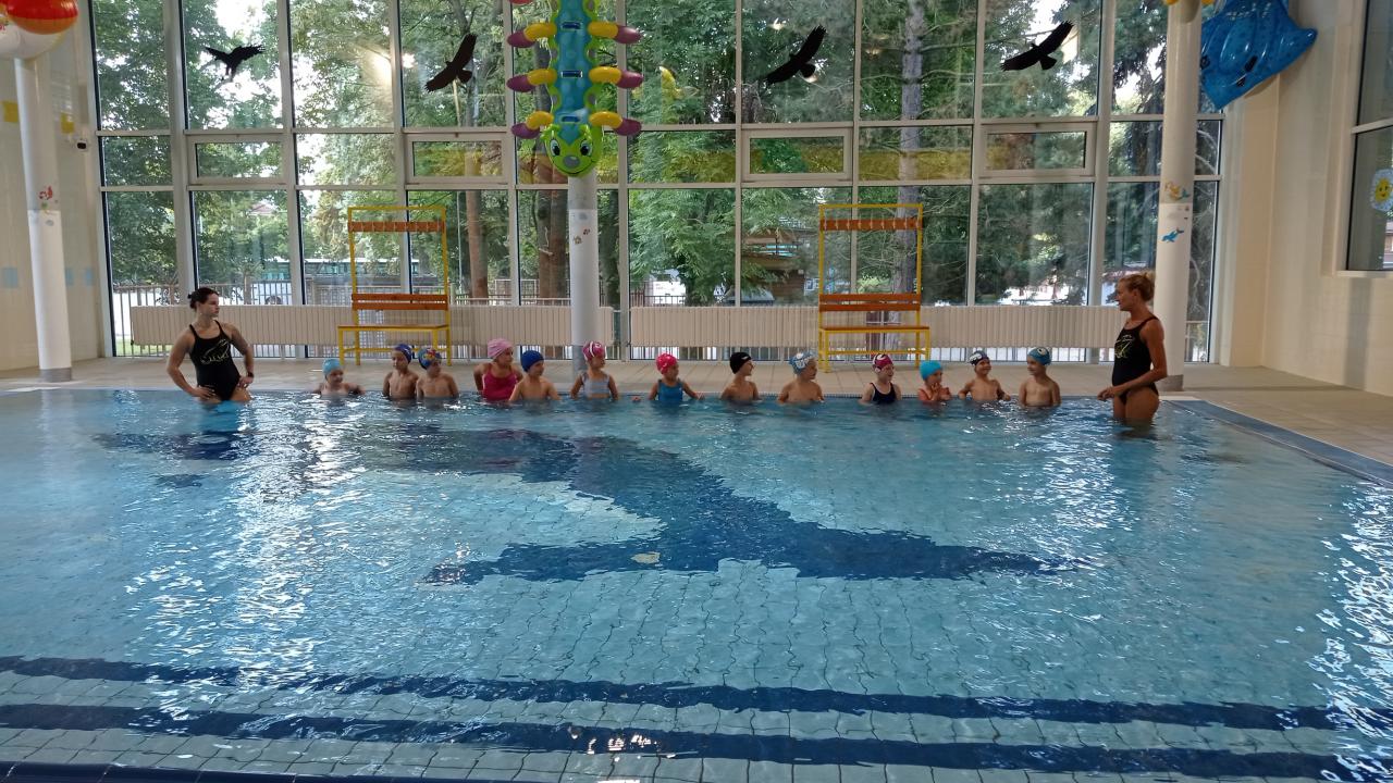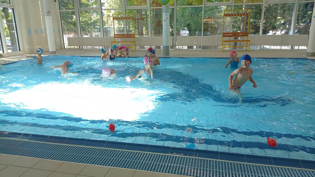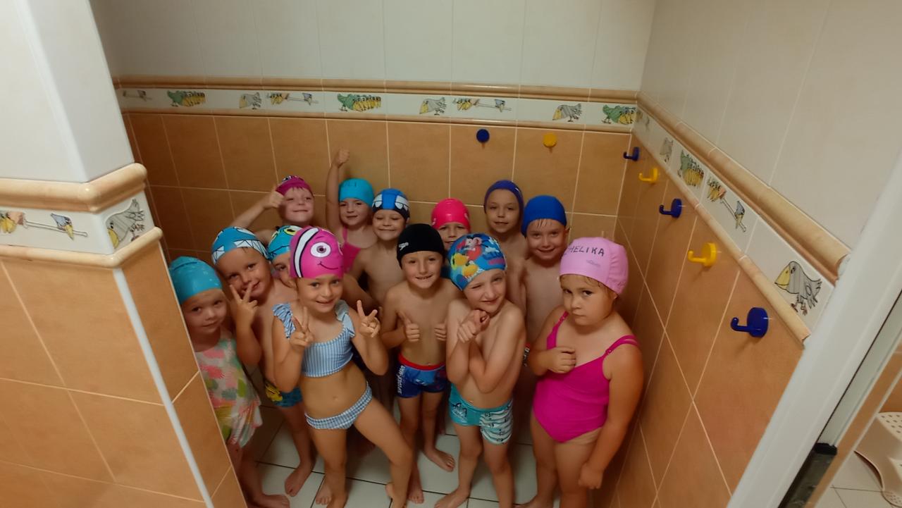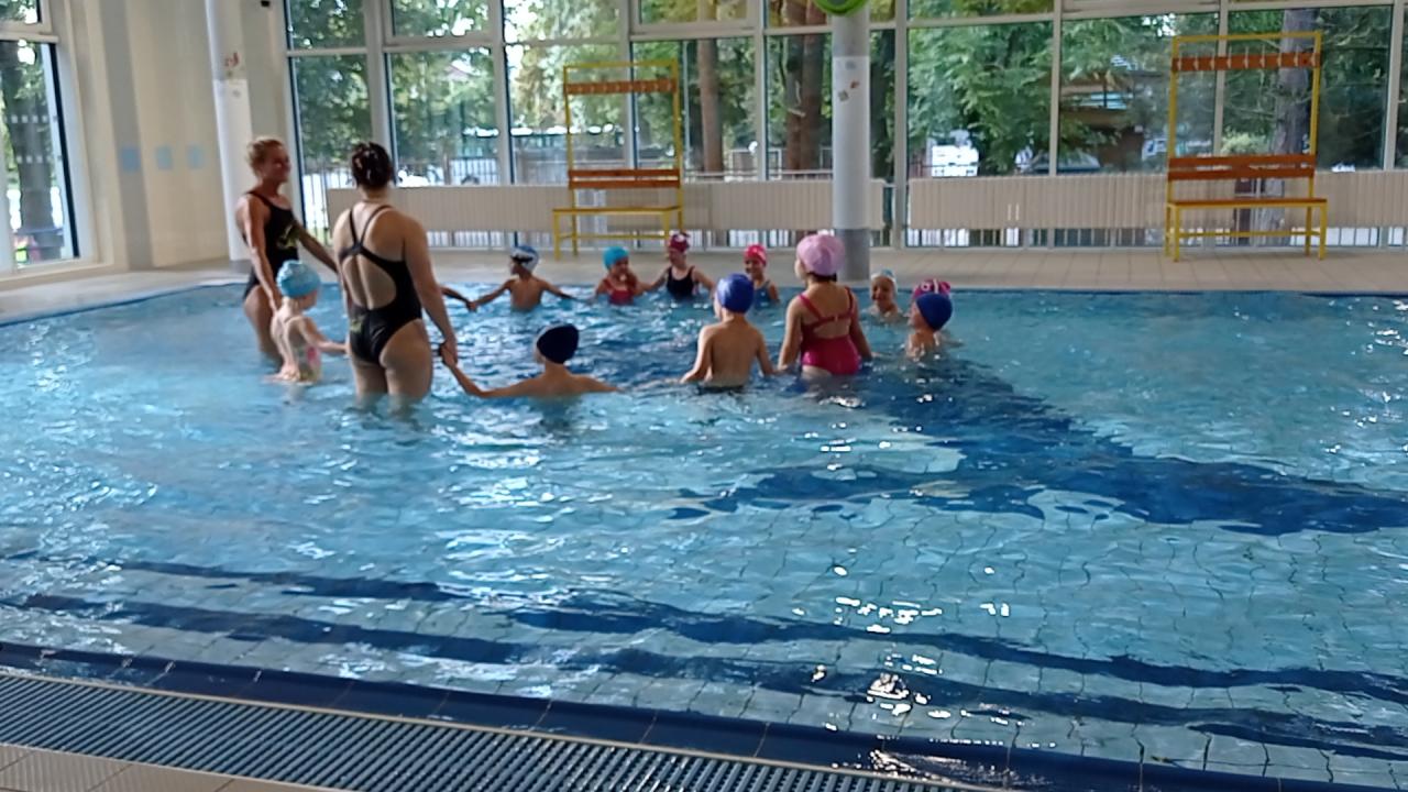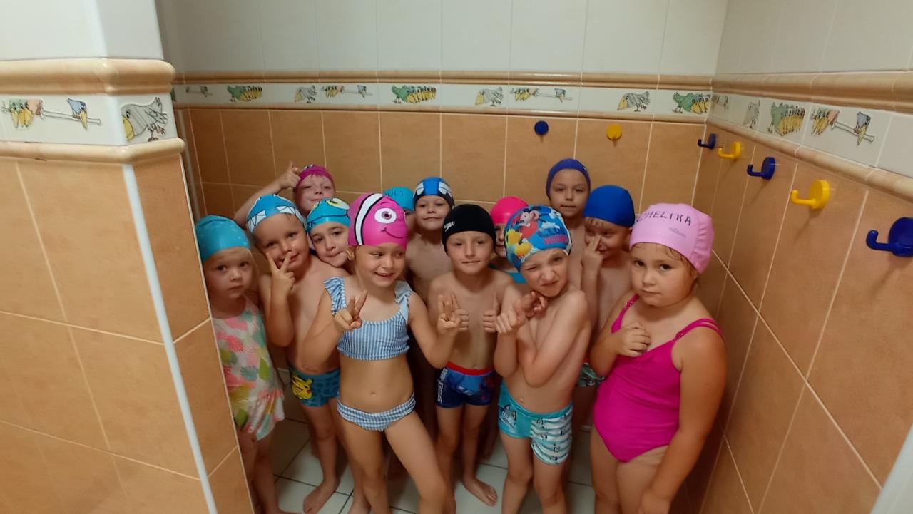 První lekce - seznamování s vodou. Had leze z díry, Kolo mlýnský, hrajeme si na zvířátka... My se vody nebojíme!