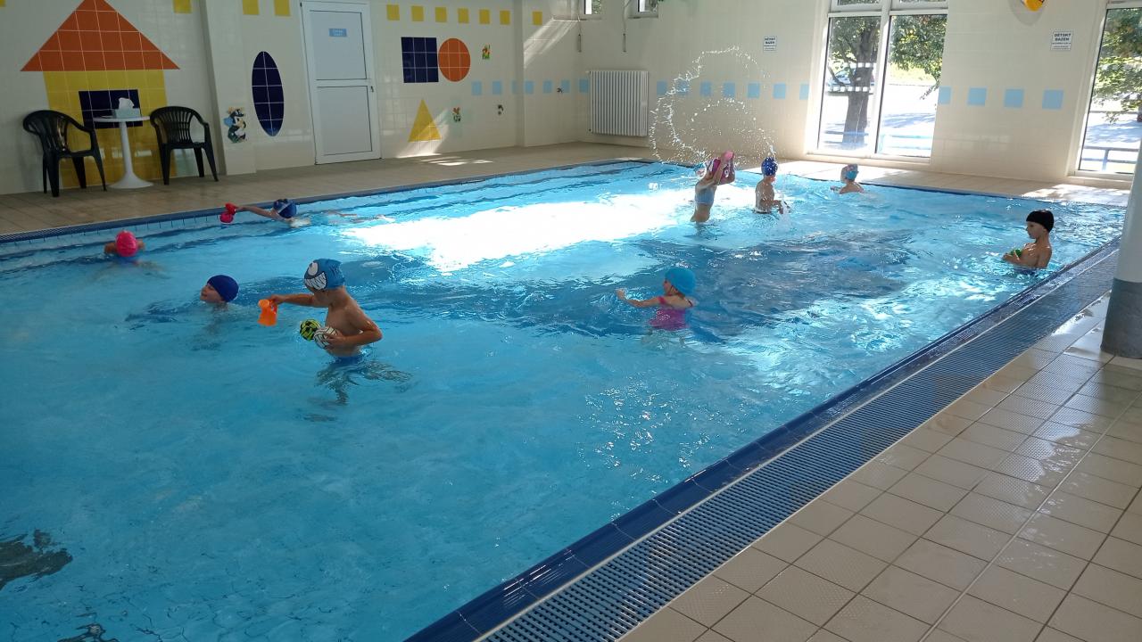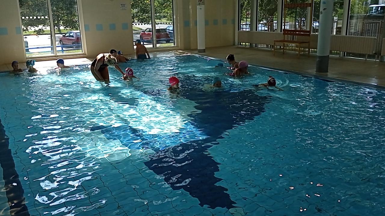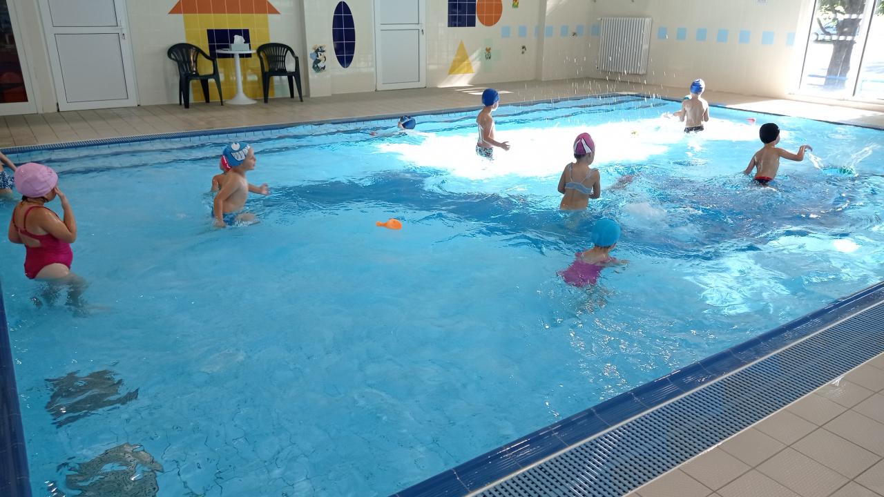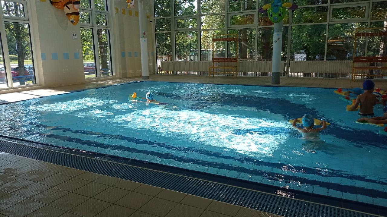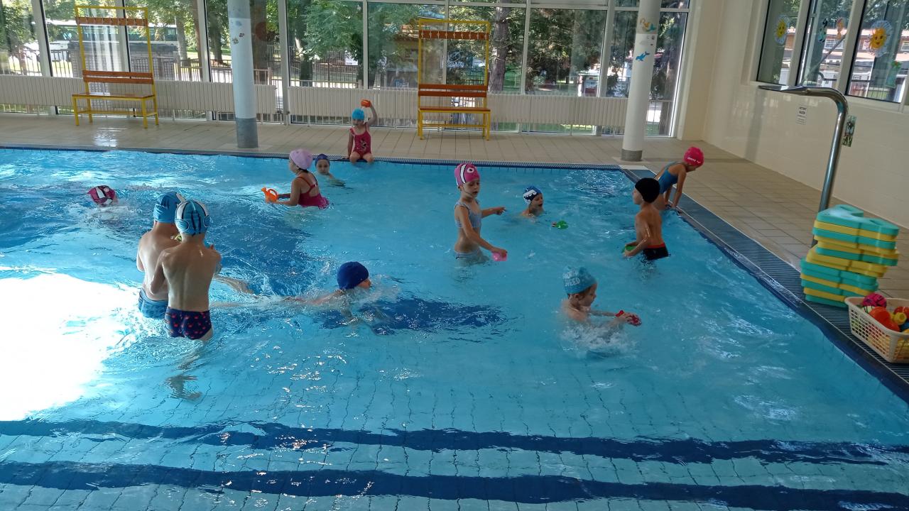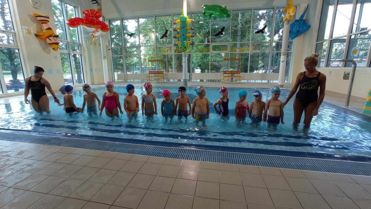 První lekce - seznamování s vodou. Had leze z díry, Kolo mlýnský, hrajeme si na zvířátka... My se vody nebojíme!