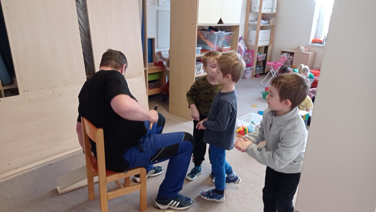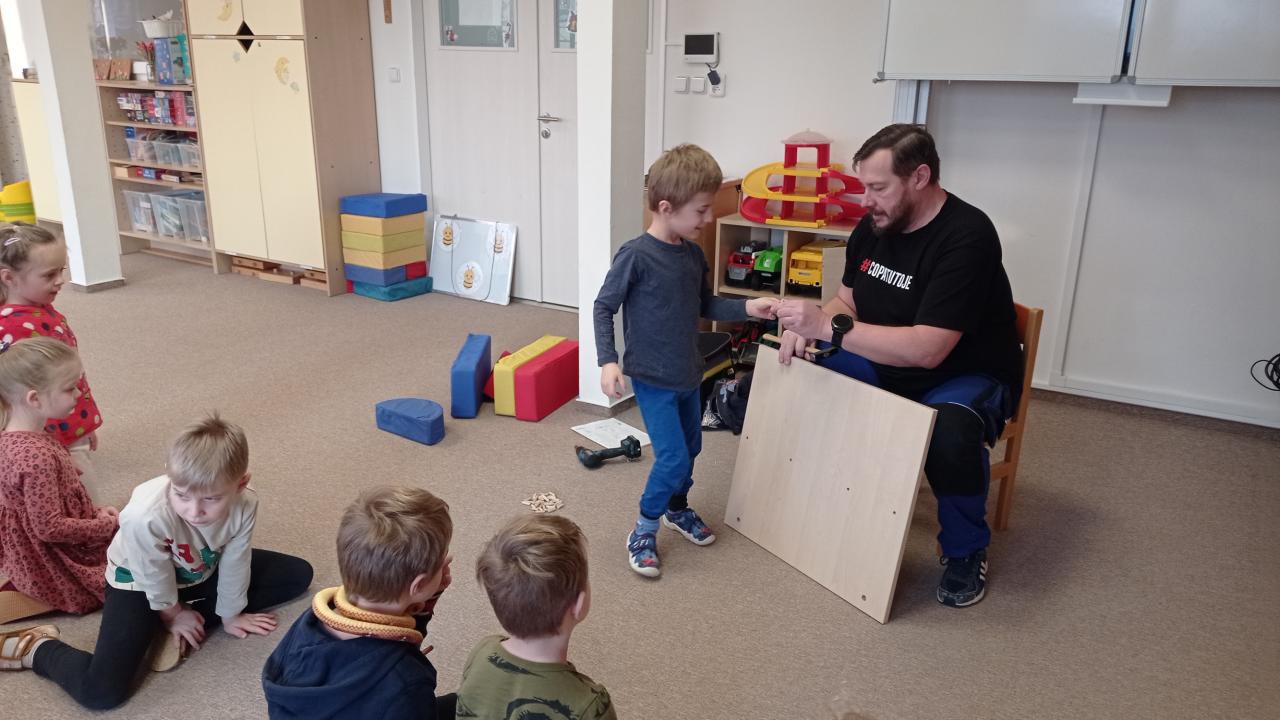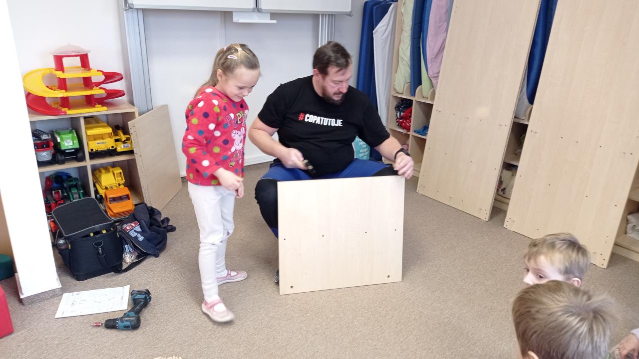 Pan školník (správce budov) přišel do naší třídy smontovat nové skříně na lůžkoviny. To bylo něco pro včeličky, paní učitelka ani nevěděla, že jsou ve školce děti. S velkým zaujetím pozorovaly, jak se skládá skříň z různě velkých prken, podávaly dřevěné špalíčky, vyptávaly se na všechno, třídily špalíčky podle velikosti, počítaly jednotlivé hromádky, střídaly se v asistenci... Děkujeme p. Černému za trpělivost. Kdo si hraje, nezlobí, dnes to bylo "práce hrou".