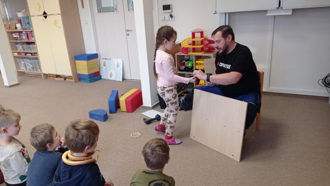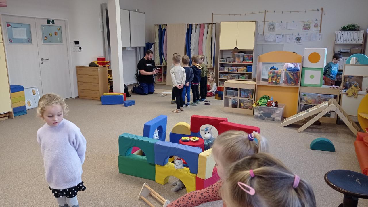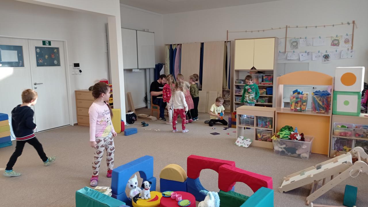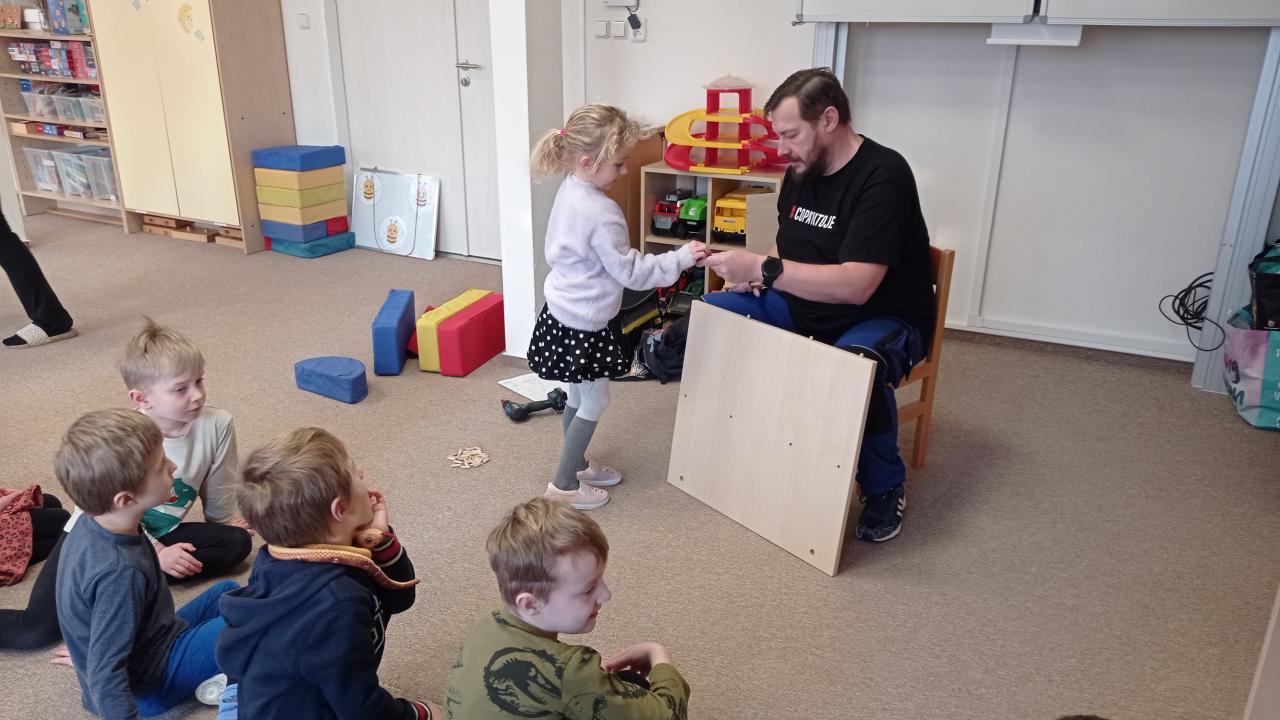 Pan školník (správce budov) přišel do naší třídy smontovat nové skříně na lůžkoviny. To bylo něco pro včeličky, paní učitelka ani nevěděla, že jsou ve školce děti. S velkým zaujetím pozorovaly, jak se skládá skříň z různě velkých prken, podávaly dřevěné špalíčky, vyptávaly se na všechno, třídily špalíčky podle velikosti, počítaly jednotlivé hromádky, střídaly se v asistenci... Děkujeme p. Černému za trpělivost. Kdo si hraje, nezlobí, dnes to bylo "práce hrou".