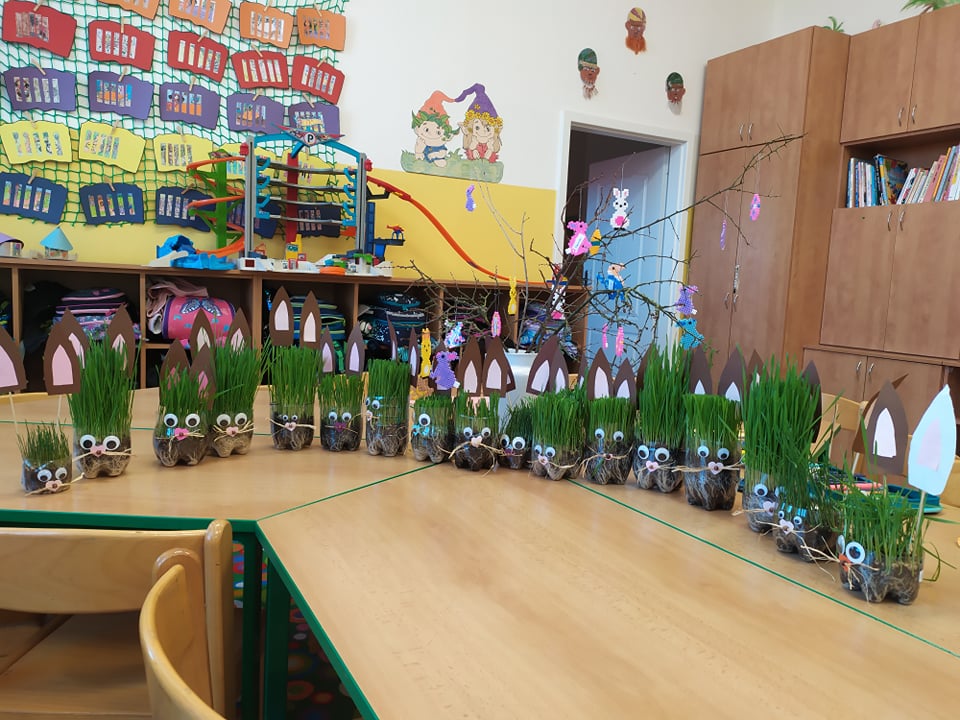 Před Velikonocemi jsme se postupně seznamovali se zvyky spojenými s modrým pondělím, šedým (žlutým) úterým a škaredou středou. Každý "barevný" den jsme trávili ve stejně barevném tričku. Co by to bylo za Velikonoce bez osení. Ani letos nechybělo. Tentokrát jsme využili abcyklace pet lahví a použili je jako nádobu na vysetí osení. Z tohoto základu vznikl zajíček, kterým děti obdarovaly rodiče, ale také svoje paní učitelky a dokonce i pana ředitele.