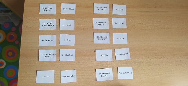 Ku příležitost Dne Země jsme si zopakovali termíny recyklace a abcyklace. Ve dvojicíh jsme v kvízu o rozkládání odpadků v přírodě přiřazovali jednotlivé druhy odpadků a dobu jejich rozkladu. Připravili jsme materiál k výrobě hřbitova odpadků. Uklidili jsme okolí školního hřiště a naaranžovali samotný "hřbitov". Informace poslouží minimálně jako přehled a k zamyšlení pro každého z nás nad třízením odpadků. Abychom mohli odpad třídit i my v družině, byly do družiny pořízeny nové odpadkové koše.