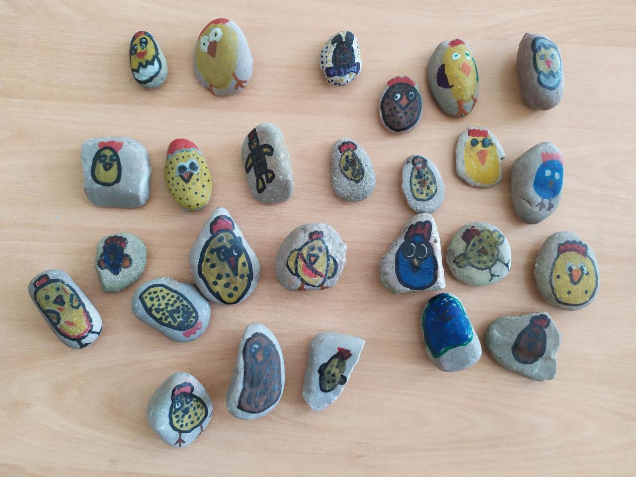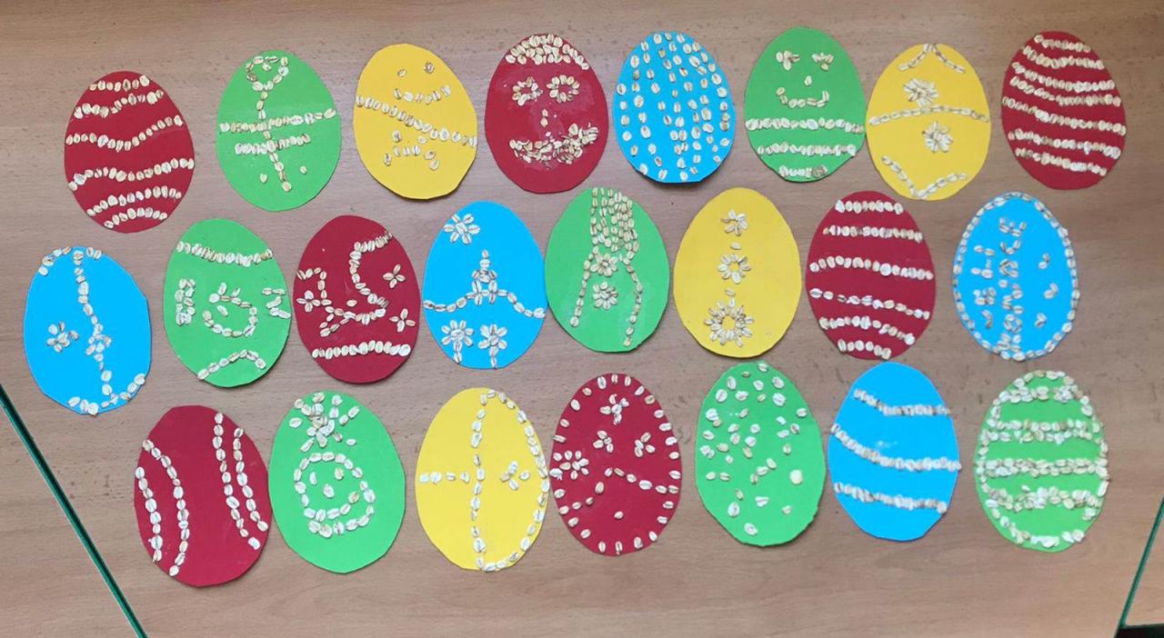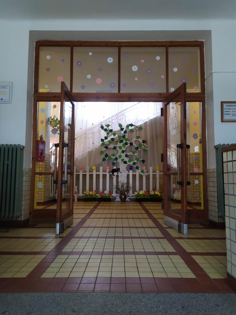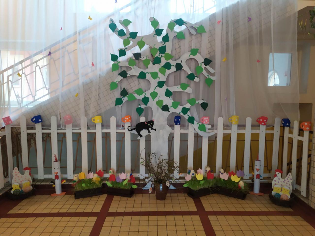 Během března se vestibul školy postupně začal proměňovat a dostávat jarní nádech - na bříze začaly rašit listy, jarní osení zdobily tulipány a nazdobená vajíčka, sem tam poletovali motýlci, kočka se vyhřívala na stromě. Naše celodružinové tvoření jsme si doopravdy užívali. Obkreslovali jsme, stříhali, lepili, zdobili a kreslili speciálními fixami. Díky tomu vznikal nejen veselý zápich s kuřátkem, ale i velikonoční košíček s králíčky a vajíčky, přáníčka se zajíčky, kamínky s kuřátky a slepičkami a nakonec i zdobená vajíčka. Malí autoři udělali určičtě rodičům radost a svými výrobky si tak mohli vyzdobit svůj domov.