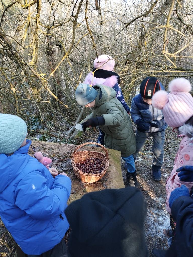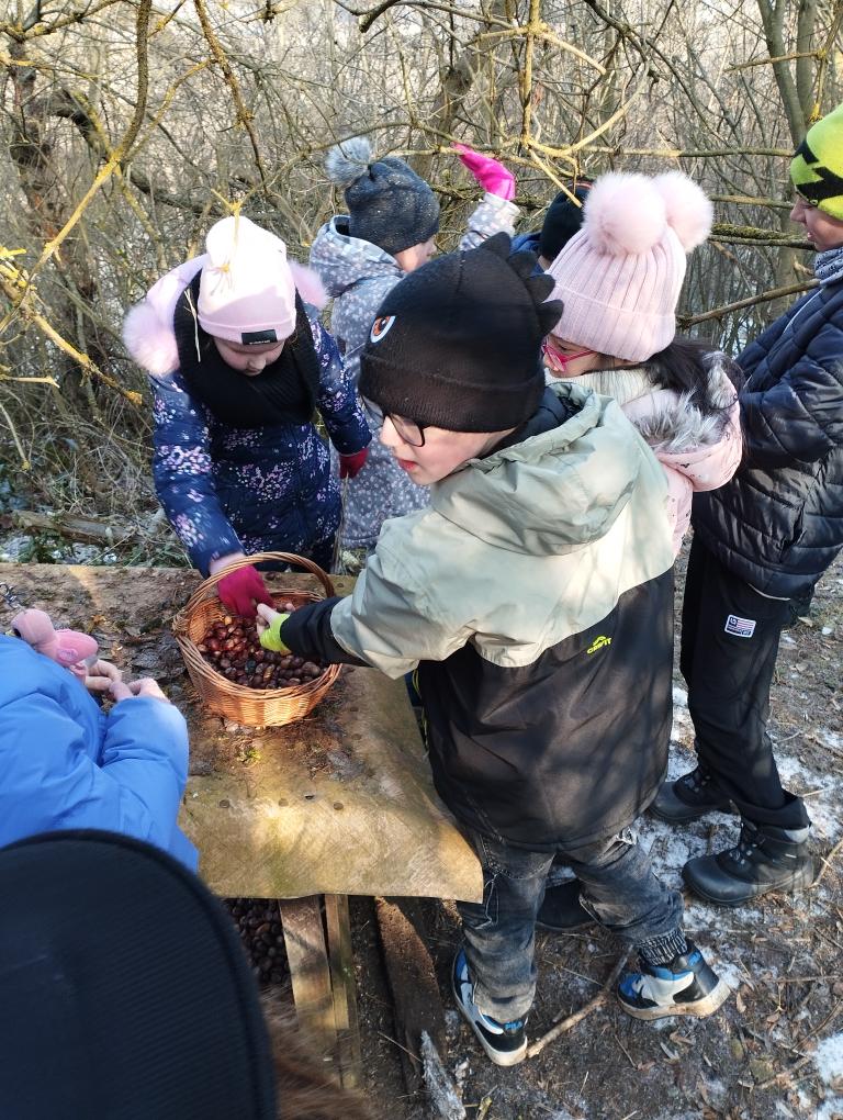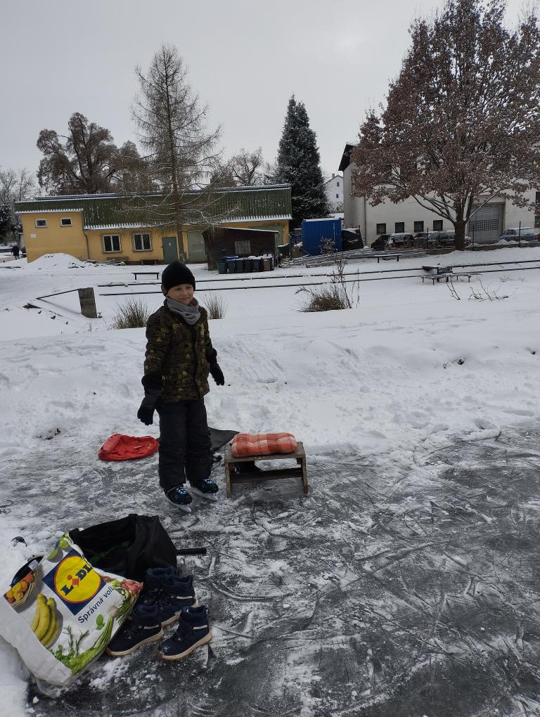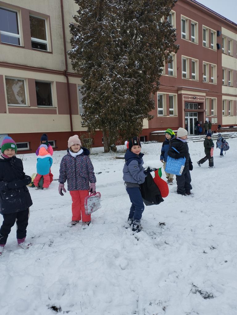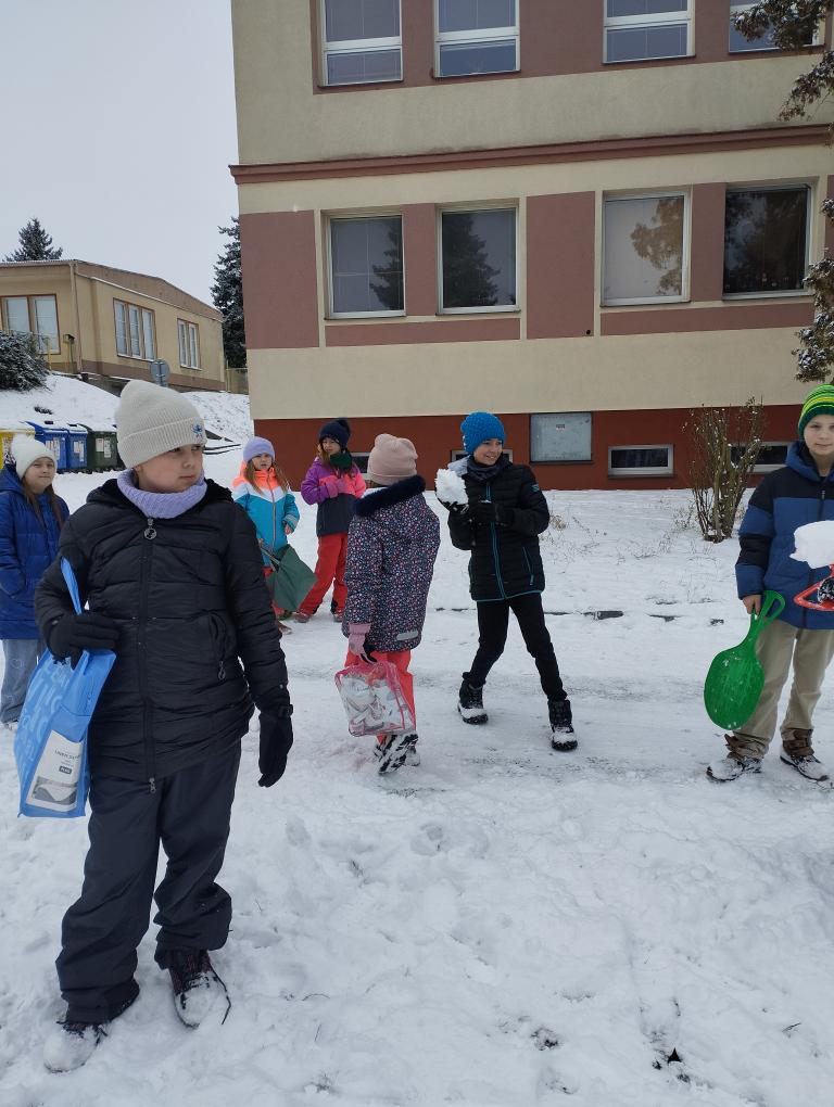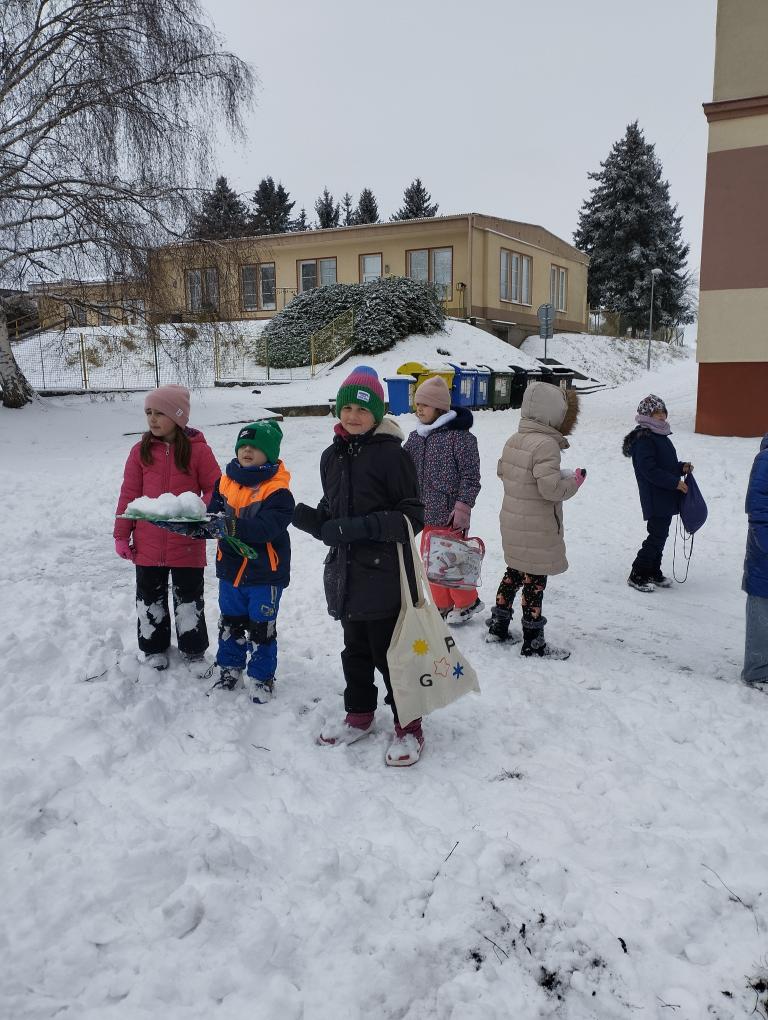 Díky úžasnému i proměnlivému lednovému počasí jsme si užili spoustu zimních radovánek. Napadl nám sníh, tak jsme si pořádně zabobovali. Zamrzl nám rybník a my byli společně bruslit, někteří dokonce poprvé. Když přišla obleva, tak nás sluníčko vytáhlo i na tartanové hřiště za školou. A pak nám napadla zase halda sněhu a my jsme opět vyrazili na boby. Zasněženou krajinou jsme se také vydali k blízkému krmítku s dobrotami pro zvířtka. S podzimního tvoření nám zbylo spoustu kaštanů a žaludů a některé děti také přinesly mrkev a jablíčka.