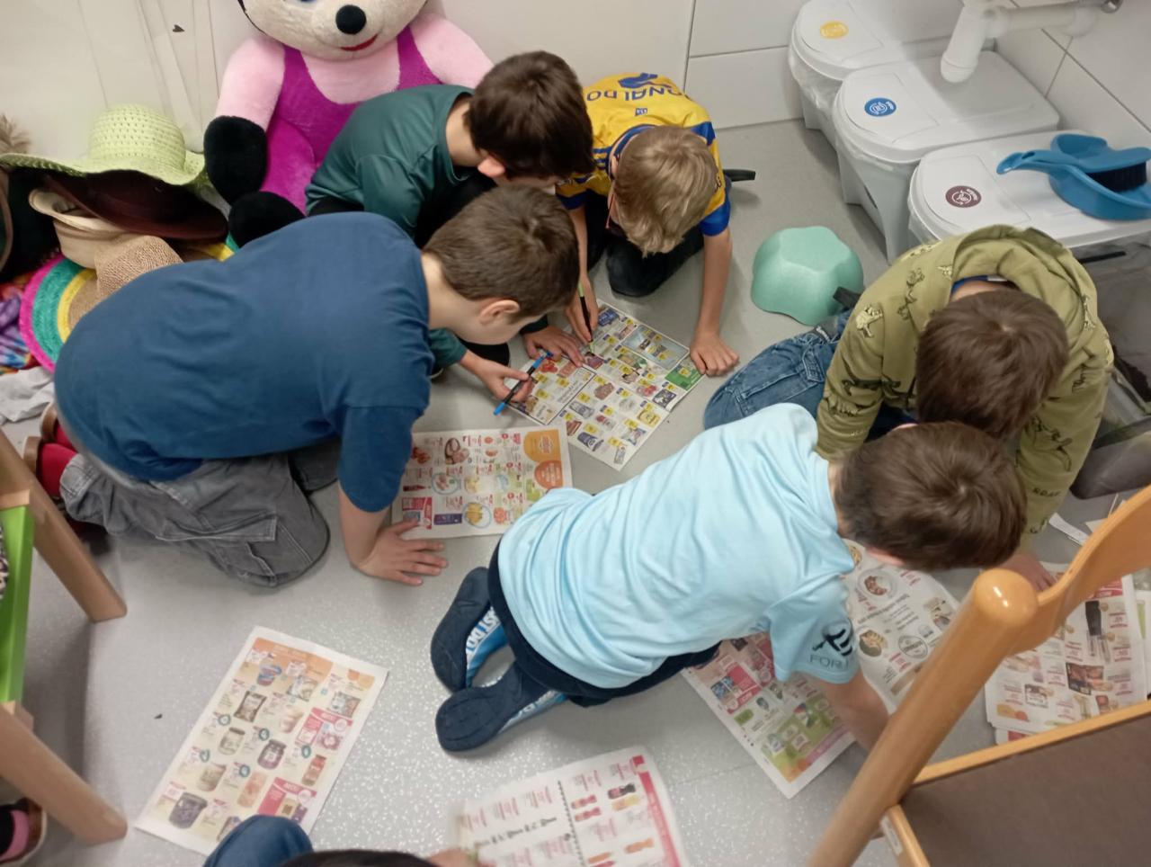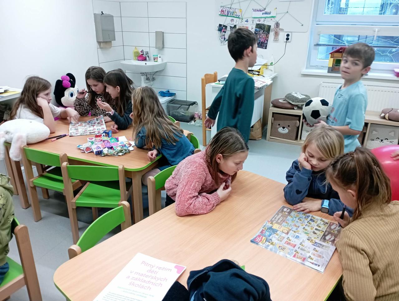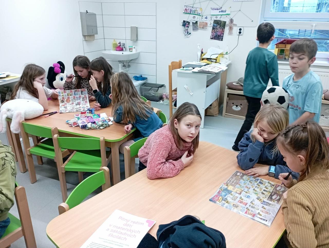Pozornost jsme věnovali i duševní pohodě člověka – hovořili jsme o tom, že stres škodí a že je důležité umět také odpočívat. Dopřáli jsme si společnou „pohodovou“ chvilku u pohádky Život k sežrání, kterou vřele doporučujeme i dospělým, a následně jsme se k tématu vraceli při společné diskuzi. Pomocí letáků z obchodů děti vyhledávaly potraviny, které jsou pro naše tělo prospěšné, a naopak ty, které mu škodí.