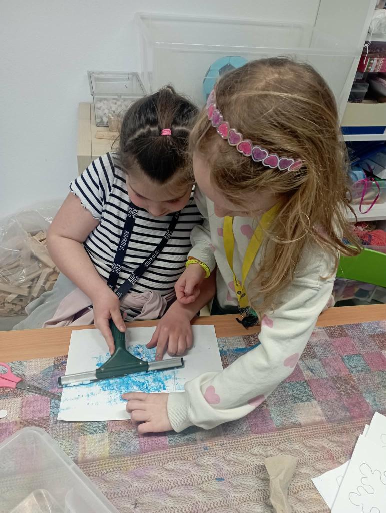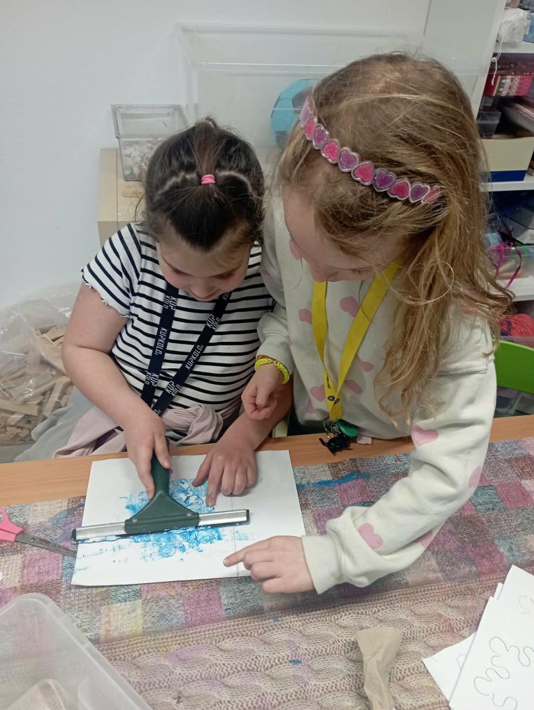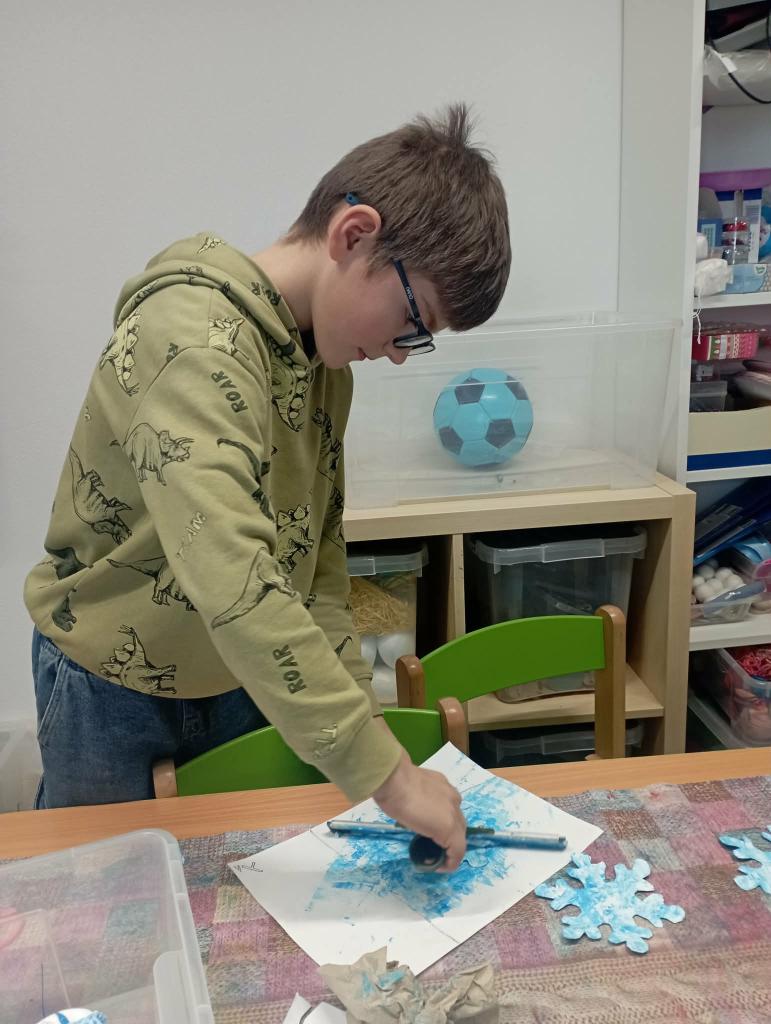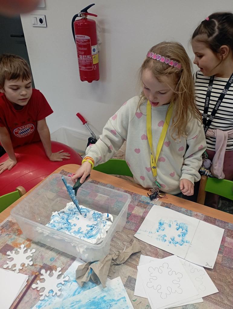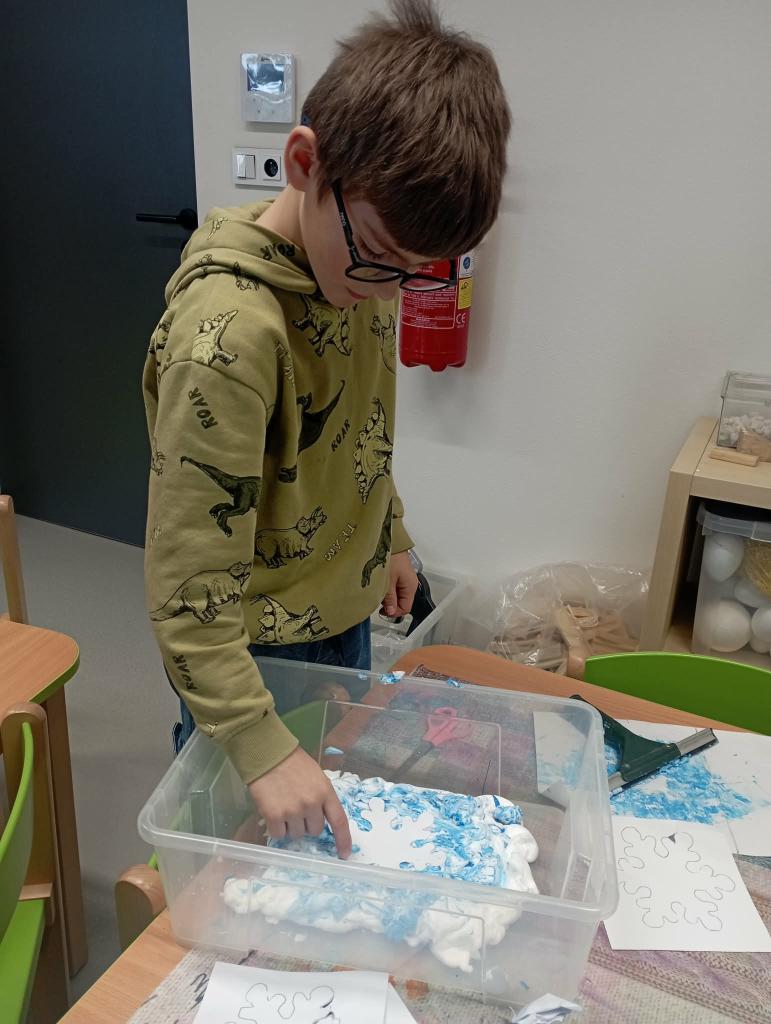 V rámci rozvoje jemné motoriky jsme tvořili zalaminované barevné záložky, které byly připravovány i pro budoucí prvňáčky. Další oblíbenou aktivitou bylo vytváření zimních vloček pomocí holicí pěny a barev metodou otisku na papír. Nezapomněli jsme ani na naše družinové mazlíčky – šnečky, kterým děti s nadšením připravily nové průlezky.