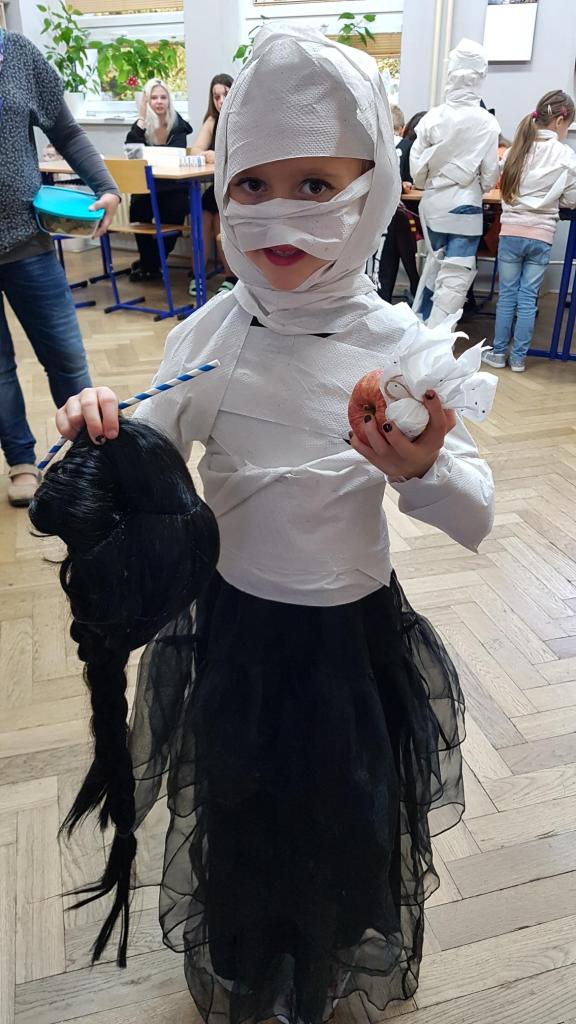 Na 31.říjen přichystali žáci 9.třídy společně s paní učitelkou Havelkovou a za pomoci asistentek Dany Špičákové a Petry Forejtové pro děti z prvních tříd báječnou halloweenskou oslavu plnou zajímavého vyprávění a halloweenských činností. Prvňáčci vařili kouzelné lektvary, které si mohli také sami vypít, hledali utajený poklad v krabici pouze hmatem, chytali ústy plovoucí jablka, z papírových kapesníčků tvořili malé duchy, legračně brčkem přendavali z tácku na tácek lentilky, které pak mohli sníst, mohli si proběhnout strašidelnou překážkovou dráhu a kdo měl odvahu, mohl se nechat omotat toaletním papírem a nechat ze sebe udělat mumii…. Jen se podívejte, jak se na to naše třída vyparádila 😊. Děkujeme nejen všem z 9.třídy, ale i maminkám za jejich pochopení a za to, jak prvňáčky halloweensky vybavily :-) :-) :-).
