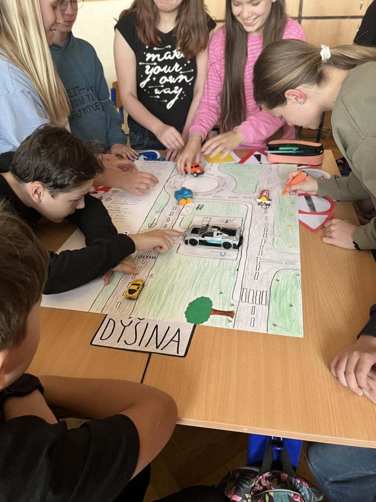 Během hodin výchovy ke zdraví jsme se seznamovali i s dopravními předpisy a bezpečným chováním na silnici i mimo ni. Některé situace jsme si zkoušely i prakticky s autíčky na našem nakresleném plánku.
